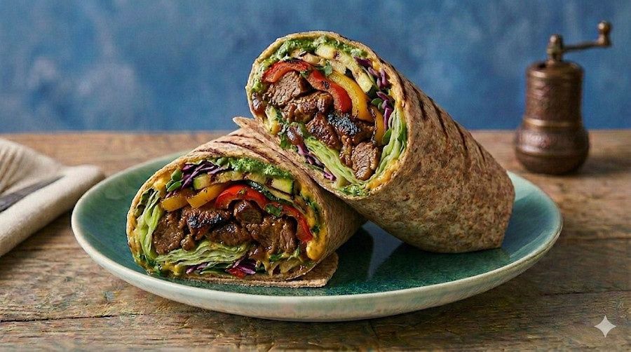 Tender mutton filling rolled with crisp veggies and flavorful sauces for a perfect bite.