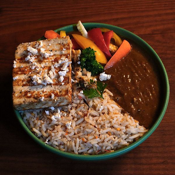Grilled Paneer served with steamed brown rice, exotic sautéed veggies and oil free Indian curry.